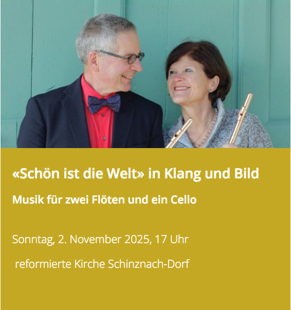 Brita Ostertag und Philipp Bachofner haben während der Pandemie Videoclips produziert und führen sie heute live auf. Klassische Musik, von Bildern untermalt, ist leichter fassbar und eingängiger – ein erweitertes Konzerterlebnis mit Werken von Joseph Haydn, Johann Sebastian Bach, François Devienne, ergänzt mit Stücken von Mike Curtis und Ross Edwards. Das Flötistenpaar musiziert zusammen mit Lev Sivkov, Solocellist am Opernhaus in Zürich.